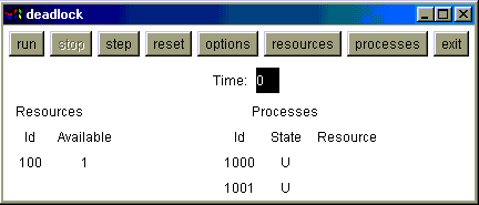 The program will display a window allowing you to run the simulator. You will notice a row of command buttons across the top, and an informational display below. The left side of the information display lists the resources and the number of available instances for each, and the right side lists the processes and the current status for each.