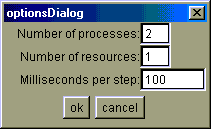 options allows you to change various options for the simulator, including the number of resources and the number of processes.