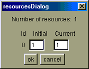 initial-available-for-resource... Specifies the initial number of instances available for each resource. This should be a sequence of non-negative numbers. For example, "2 1 2 0" indicates that there are four resources, and there are initially two instances of resource 0, one instance of resource 1, two instances of resource 2, and zero instances of resource 3. The number of resources may also be entered or modified using the Options Dialog (see below). The initial number of instances available for each resource may be entered or modified using the Resources Dialog (see below).