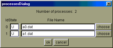 Number of Processes: The number of processes to use in the simulation. This should be a non-negative number, usually at least two. Although the program does not enforce a limit, you may not be able to view more than about 10 processes on the informational display on your display screen. The initial value for this option is obtained from the second parameter on the command line, or zero, if not specified. Keep in mind that each process should have a process command file. To set properties for individual processes, use the Processes Dialog (see below).